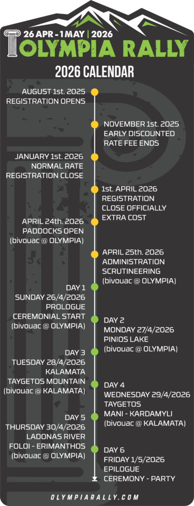 You can participate with your National License with a Starting Permission Letter from your Federation to info@olympiarally.gr and / or amotoe@amotoe.gr for NMN 36 / 424